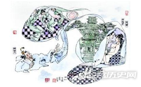 一会儿,下面过来几个小太监,见太监悬在半空中,都吓坏了,爬上楼一起察看,只见葛藤一头系在窗棂上。他们想解开救人,但藤细得不敢用力。于是,小太监们开始到处寻找道人,哪里还有道人的踪影。他们束手无策,只得禀报鲁王。鲁王过来一看,大为惊奇,命令在楼下铺上厚厚的茅草和棉絮,然后再弄断葛藤。刚铺好,葛藤“嘣”的一声自己断了,太监掉下来。大家相互看着,不禁大笑起来。鲁王连忙命令查访道人下落。有消息说他住在尚秀才家。派人前往查问,说是道人出游未归。后来王府的人在途中遇见道士,就引着道士去见鲁王。鲁王赐他在宴席上就坐,请他当场表演戏法。道士说:“我是草野之民,没有别的本领,既蒙王爷信任,请允许我献上一台歌舞为大王祝寿。”于是从袖中取出一个小美人放在地上,小美人恭恭敬敬地向鲁王磕头之后,道士叫她演出《瑶池宴》,祝福鲁王万寿无疆。小美人念了几句开场白。道士又从袖中取出一个小美女,她自称王母娘娘。过了一会儿,董双成、许飞琼及所有仙女一个挨一个走出来,最后织女出来晋见,并献上一件天衣,流光溢彩,绚烂夺目,辉映满室。鲁王心想天衣肯定是假的,叫拿来看看。道士急忙说:“不行!”鲁王不听,硬是拿来看了,果然是无缝的天衣,不是人工所能制作出来的。