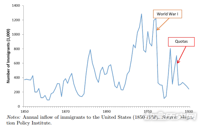 作者之所以选取20世纪初的欧洲大移民作为研究背景,一方面是因为这段时期是美国移民史上最辉煌的时期;另一方面也是因为在这期间,一战的爆发和后续《美国移民法案》的出台,导致了欧洲国家在移民上遭受到了不同程度的外生冲击(见图1)。为了识别历史移民对现在美国人政治偏好的影响,作者沿用了在移民研究中惯常的偏离-份额法(shift-share)来构建工具变量,即用过去某地的移民情况来预测之后的新移民数量。因此,这段特殊历史时期使得该工具变量在某种程度上具有外生性。