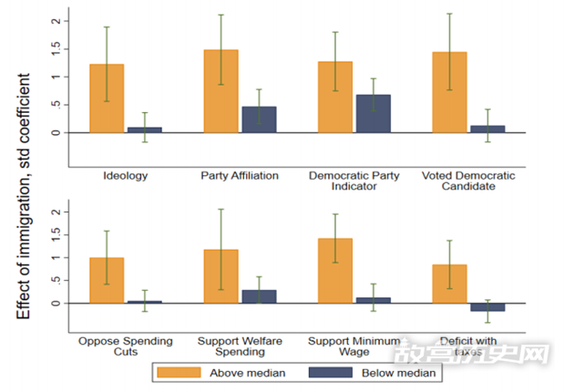 对此结果,作者首先从多个角度考察了历史上的移民对本土美国人政治意识形态可能的影响机制。第一种可能是移民带来的直接经济影响,导致了本土民众的就业机会和收入减少,这反过来会增加本土民众对政府增加开支的需求。然而,与此相悖的是,无论是长期、还是短期上,移民实际上对经济发展产生了积极的影响,显然这种机制是不成立的;第二种可能是当时移民的社会经济地位导致了本土民众“左倾”思想的转变。然而,作者在尽力控制了当时移民的种种特征下,这种影响关系依然存在;第三种解释是移民的“自选择”问题导致了美国人对再分配思想的积极影响。但是,研究表明当时移民具有更强烈的个人主义,这只可能会导致本土民众偏离“左倾”观点。最后,作者还证实了这些欧洲移民当时的跨代流动(intergenerational mobility)程度,也并未对今天的本土美国人政治意识形态产生影响。