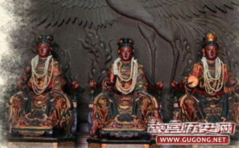 三霄娘娘 为云霄、琼霄、碧霄的合称,为感应随世仙姑正神(又称感应随世三仙姑)。是道教神话传说中的三位仙女,为财神爷赵公明的三个结义妹妹。她们执掌混元金斗,凡是神、仙、人、圣、诸侯、天子等,不论贵贱贫愚与否,降生都要从金斗转动。从前信士求儿女,都要拜三霄娘娘所以现也有人称三霄娘娘为送子娘娘或送子奶奶。现今紫霄宫父母殿内供奉有三霄娘娘。头戴饰宝凤冠,身着华丽服饰,面容丰润慈祥,各持宝物,文雅端坐。