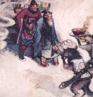 白老汉见此情景,吓得浑身哆嗦。丁某便用自己的身体挡护着白老汉走进去。白老汉的儿子白甲正好从屋里出来,看见父亲和丁某非常高兴,稍稍坐了一会,便叫仆人去办筵席。忽然一只大狼衔着一个死人进来,白老汉战战兢兢地站起来说:“这是干什么呀?”白甲说:“对付着做几样菜吧。”老汉急忙制止他,心里惶惶不安,想离开,却又被狼群拦住了道。正当进退两难时,忽然见群狼乱纷地嗥叫奔逃,有的钻到床底下,有的趴在桌底下,白老汉惊呆了。一会儿有两个身披金甲的猛士瞪着眼睛跑进来,拿出一条乌亮的铁索把白甲绑起来。白甲扑地变成猛虎,牙齿又尖又长。一个金甲猛士拔出利剑要砍掉虎头,另一个说:“且慢!且慢!这是明年四月的事,不如先把虎牙敲掉。”便拿出大锤猛敲虎牙,虎牙一颗颗掉在地上,老虎痛得大吼大叫,声音震得地动山摇。白老汉这回吓得魂飞魄散,汗如雨下。