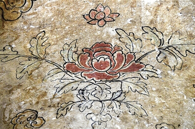 记者在发掘现场看到,主墓墓室内壁布满彩色壁画,以黑、红两色为主,间有青、绿、黄三色。墓室顶部绘有云气,牡丹、菊花、莲花等花卉,以及鼓、钹、笙、快板、笛、手鼓、琴、腰鼓等乐器。东西两壁画面以云气、栏杆、荷花为主,由于被潮湿的淤泥覆盖,北壁目前仅清理出顶部,画面为歇山顶房屋建筑。