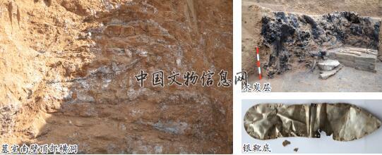M1 为圆形竖穴土坑墓。南部为甬道,底部有生土二层台,二层台内为墓室。墓圹上口距地表1.6 米,平面呈圆形,剖面大体呈袋状, 斜壁,平底。口部直径6 米,底部直径6.4 米,深1.35 米。甬道在墓室南部,距地表2.35 米,被盗墓横洞从南北向贯穿。南端在墓圹上,北端与墓室相通。方向340°。两侧下部为生土修成的土墙,上部为毛石干垒石墙。土墙高0.45米,毛石干垒石墙共有5 层,高约0.7 米,宽0.4 米。石墙长1.9米,束腰状,南、北口皆宽1.3 米,中宽1 米。甬道顶部石块上可见红色柏木残存,可知顶部原搭有柏木顶。甬道地面为生土。二层台位于墓圹底部,距地表2.95 米。在红色生土上挖掘而成,呈六边形。东、西两侧二层台的上部有红色粘土层,平面大体呈月牙形,厚约5 厘米。二层台上部为斜坡状,下部直立。最宽处0.5 米,高0.9 米。墓室距墓圹口1.93 米。呈六边形,边长1.5 米,从外向内依次为填土层、木炭层、柏木护墙、柏木墙护石。木炭层上部与二层台中间有填土层,为疏松的灰褐色填土,夹杂小石块,宽30 厘米、厚30 厘米。木炭层下部紧贴二层台内侧,为粗细不一木炭竖立构成,厚0.3 米。木炭所用木材由原木略做修整而成,枝杈清晰可见。各角上的木炭较粗,应为立柱,保存较好,高0.8 米,直径0.15 米。立柱之间的木炭较细,略有倾斜。木炭层下与铺地砖间有厚10 厘米红色黏土。木炭层内侧部分区域残存红色柏木痕迹,应为护墙。柏木横放,似为三层拼起,原高0.9 米,厚0.1 米。柏木墙内侧原应有一圈用于加固木炭墙及柏木墙的石块,由于墓室被盗扰,现仅在甬道处及尸床西侧地面可见少量残存石块。墓室顶部未发现任何类似墓顶的遮盖遗迹,从甬道上搭有柏木板分析,墓室原来也可能有木板制成的顶部,或许被盗坑整体破坏无存。墓室地面用青砖沿二层台内侧边缘平铺,地面东西3.8米,南北3.9 米。接近甬道口处地面用38×18×7 厘米长条砖铺砌。中部为36×36×7 厘米方砖铺砌,各边角处以方砖碎块拼合。墓室北壁处为东西向的砖砌尸床。东部被盗坑破坏,仅存西部和东端。尸床原为四层,中间以36×36×7 厘米方砖平砌,东西两端以38×18×7 厘米长条砖砌边。原长2.25 米,西部残长0.9 米,东部残长0.26 米,宽0.72 米,高0.28 米。尸床上可见下肢骨、足骨三段,大体平行。足骨在西侧,可知人骨头向东。下肢骨骨骼以上均被盗坑破坏无存。从骨骼形态、大小分析,应为两个个体。其中北部、中部骨骼属于一个个体,放置于尸床中部,形态自然,骨骼较为纤细,可能为女性。与之相比,南侧人骨位于尸床边缘,尸床南侧被扰乱的填土中发现另一段人骨,可与之相配,属同一个个体,骨骼较为粗壮,似为男性。可知该墓葬为2 人合葬,女性先行下葬,男性则为后来葬入,而尸床的宽度仅可容一人,造成了后来葬入者难以容身,勉强将其放置在女性南侧,致使部分骨骼掉落于尸床下。墓圹南侧顶部有灰坑一座,开口于②层下,打破墓圹及填土,距地表1 米。平面近似椭圆形,南北1.9 米、东西1.7 米、深1.3 米。斜壁,圜底。填土以草木灰烬为主,有明显层次,夹杂少量素面碎砖块。该灰坑与墓葬开口于同一层位,打破墓圹,或与下葬完毕后举行祭祀活动有关。灰坑南壁底部有横洞一个,下距灰坑底40厘米,南北向,洞口立面呈半圆形,与灰坑相通,底径70厘米,高50厘米。洞深1米,洞内有填土,分层,较硬,每层厚约10厘米。该横洞应附属于灰坑。此次清理仅在墓室扰土内发现少量遗物。种类有铜丝网衣上的银靴底、“开元通宝”铜钱、鎏金铜带銙残片、牛皮带残片、白瓷片等。
