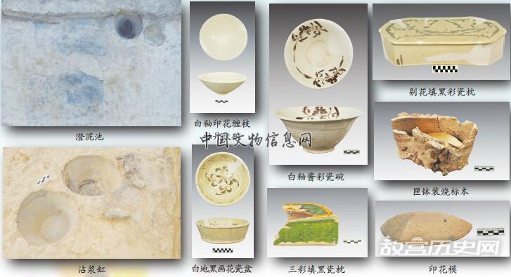出土遗物以瓷片、窑具为大宗,其中可复原瓷器千余件,瓷器品类有粗白瓷、细白瓷、黑酱釉瓷及三彩瓷,器形有碗、盘、碟、罐、枕、盆、瓶、盒及器盖等,以碗、盘、碟和枕为主,装饰工艺有白地黑画花、剔花填黑彩、珍珠地划花、黑地白绘花及印花,题材以诗词、花草为主,纹样层次分明,流畅活泼,技艺娴熟。其中北涧疙瘩地点出土的北宋细白瓷,胎白而细密、坚致,釉色莹润,造型简洁大方。通过对该地点瓷片标本的X 射线荧光分析,显示其烧成温度可能极高,白度亦不逊于邢定巩白瓷,代表了同时期较高的烧造水平;下八亩地点出土的金朝细白瓷在胎、釉方面要略逊一筹,釉色多泛黄,与观台仿定器相近,器物内壁印花装饰增多;上八亩地点出土的金朝瓷枕采用剔花填黑及珍珠地划花装饰工艺,枕面饰竹节状、壶门开光,特色鲜明,工艺精湛。另外,在个别器物腹、底发现有印花或墨书的“马四”“马家椀□”等款识。