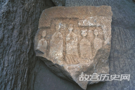 墓室深处,墓穴顶端呈空心状,与旁边的崖墓相连,疑是上层崖墓坍塌所致。进入墓室时,这里有块大石头,架在两块石板之间。后来,他们把石头取下,看到了雕像:5个拱手立人,手上拿着器具,生动活泼。