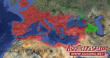 安东尼王朝皇帝图拉真(公元98年-117年)在位时,罗马帝国版图达到最大,经济空前繁荣,西起西班牙、不列颠,东到幼发拉底河上游、南自非洲北部,北达莱茵河与多瑙河一带,地中海成为帝国的内海。
