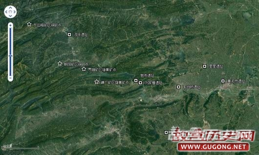 图二 采集有矿渣的遗址点与矿区位置关系图
