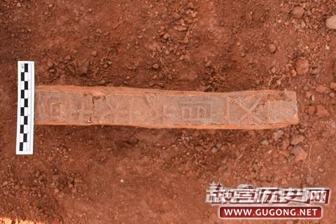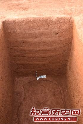 已经揭露的20座墓葬,以砖室墓为主。砖室墓除1座为“刀”形墓外,其余均为“凸”字形墓,墓室顶部保存均较差。其中M364规格较大(图五),墓室长4.2米,宽2.7米。墓砖较大,规格为43×20×7厘米,墓砖正面饰绳纹,侧面饰几何纹,此种墓砖在五里坪墓群尚属首次发现。土坑墓均为长方形竖穴土坑墓,其中在清理的M363深度超过3米,墓葬填土剖面和平面夯层清晰可见(图六)。