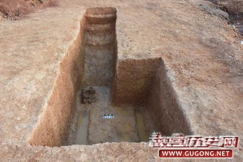 5座墓葬均为竖穴土坑墓,有长方形和“刀”形墓两种。其中M351、M352位于同一封土堆下,为长方形土坑竖穴土坑墓,两座墓基本呈南北向,排列有序,随葬器物大致相同,基本为陶器,有鼎、罐、钫、釜等。两座墓随葬陶器器类、形制基本相近,可能为夫妻合葬墓,另M351墓底填土还发现有少量朱漆痕迹(图二)。M353为带墓道的竖穴土坑墓,长方形墓室较大且深,墓道朝南,上有4级台阶,随葬品均为陶器,位于墓道近墓室处,有陶鼎、罐、釜等(图三)。