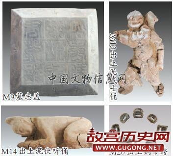 墓室内随葬的遗物主要有陶碗、陶罐、陶俑、泥俑、瓷瓶、漆盘、漆碗、漆盒、铜镜、铜带饰、铜锁、铜项饰、铜钱、铁锅、铁剪、铁刀、石像生、石砚台、石球、镇墓石、蚌壳、墓志等。泥俑的造型丰富,有镇墓兽、武士天王俑、男侍俑、女侍俑、坐俑、伏听俑、马、骆驼、灶台、磨盘等。镇墓兽置于甬道之中,墓室入口处立武士天王俑,墓室东南部放置陶瓷器及泥质生产用具,墓室西南部放置马和骆驼,人物俑遍布墓室南部。镇墓石为河卵石,放置于墓室西南角,数量多寡不一。墓志放置于棺床中部南侧,M9 为石质墓志,其余全部为陶质。 2015 年该墓地出土了6合墓志, 可辨身份的有陈禮、陈行斌、陈崇顺、陈崇顺夫人张氏,陈行斌的墓志记有“颍川陈君”,剩余2 方墓志字迹不清,其中一人亦称为“陈君”,由此可知该墓地为陈氏家族墓地。本年度再次出土6 合墓志,其中M20 的墓主为陈素,颍川人。M18 志盖上书“陈君志铭”,但志文不清。M9 的墓主为张俊,先天二年(713 年) 去世,其夫人为颍川陈氏,张俊“从附礼也”,与其妻合葬于陈氏家族墓地。M14 墓志漫漶不清,残存文字中也有“颍川”,其余墓志的志文已无法辨识。