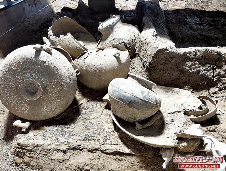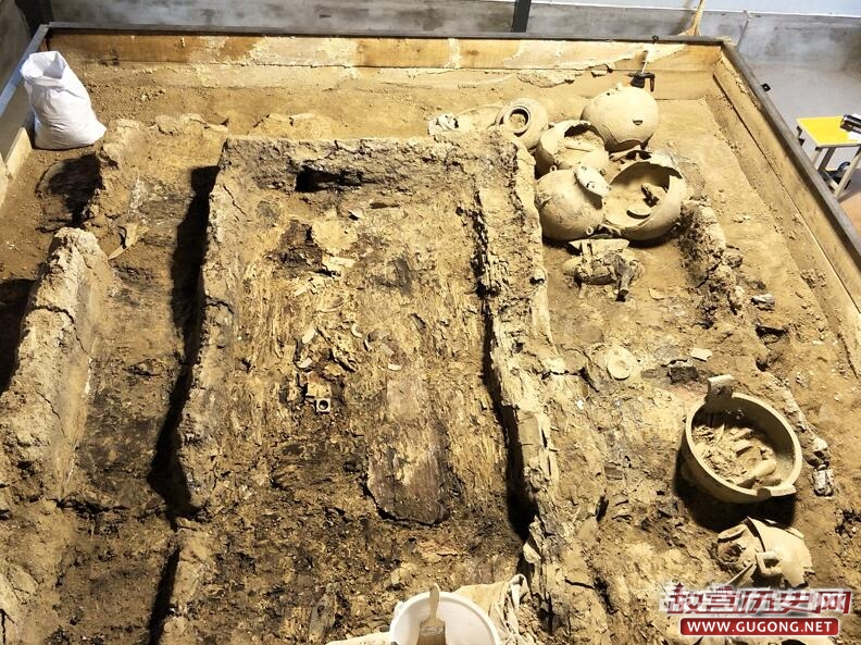 该墓室存一棺一椁,侧板腐朽,底板尚存,棺放置在椁底中部,椁室长4.95米,宽3.76米,墓主人的头部已经显现。在其喉部,带有明显戎人特征的螺旋形金耳环清晰可见。墓主人的身上,有不少玉佩、琮等玉器残片;墓主人的右边,散落着鼎、簋、壶、鬲、豆、盘、匜等青铜器,有的露出“半身”,正待进一步清理,在一个大鼎内,还有不少动物骨头,而在墓主人左上方,还有一把青铜戈。