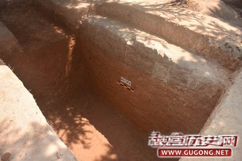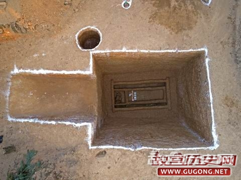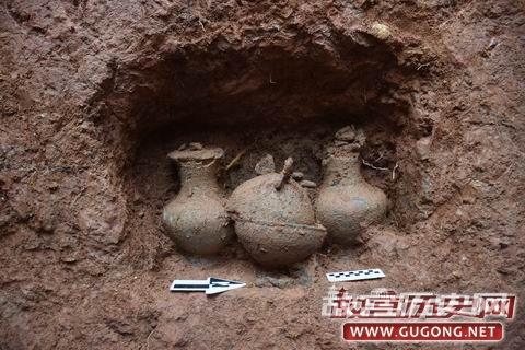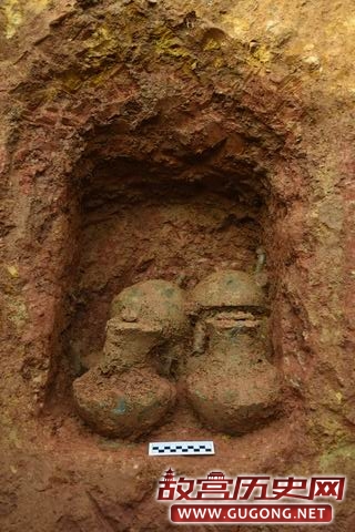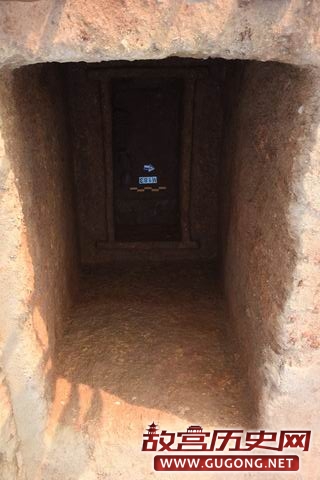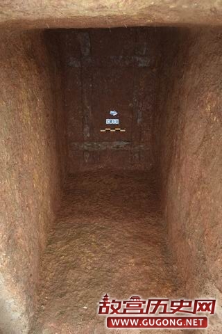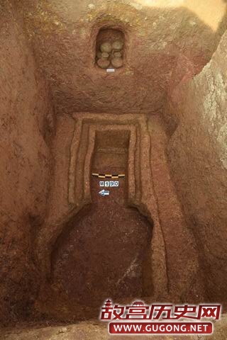 M190位于第Ⅲ发掘区,开口于表土下。M190墓口长3.5m,宽2.6m,墓深3m,墓底长3.15m,宽2m,墓壁内倾。墓道现长3.2m。M190为一棺一椁,由于M190遭到盗扰,墓道口下头箱处未见随葬器物。我们在墓道口对应一侧墓壁上发现有一壁龛,龛内随葬2壶、2敦、2鼎。(见图十五至十七)