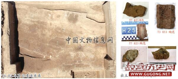 T7:H25 形状呈椭圆形, 口大底小, 斜壁。位于T7 中部,叠压于L5 下,口距地表1.80米。南北长1.40 米,东西长1.20 米,深0.55米。填土为黑褐色土,含陶范、陶片、铜针形器、红烧土块、兽骨等。H25 内出土陶范(外范和内范) 十几件,花纹精美。另外出土的铜针形器,长13 厘米,应为制范工具。