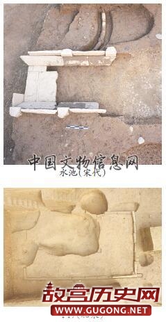 水池 均为蓄水坑和排水沟组成,蓄水坑与沟之间有孔连通。以H80、G18为例,位于ⅠTN03E04 东北部,G18 并延伸至东壁外,叠压于第4 层下,H80 平面呈长方形,北部为坎边,南部被H78打破,开口土圹残长1.70~2.06 米、残宽1.72 米,直壁底较平,深约0~0.48米。坑内壁为长方形石板砌筑,石板之间用长方形石柱相接加固,内壁仅存2层,上层较直,下层呈斜壁,底用石板铺底,南部残缺。内底残长1.70~2.20 米、残宽1.36 米,深约0~0.40 米。石板长0.92~1.0、宽0.30、厚0.05 米,石板内壁凿有浅浮雕,四周留边0.04~0.05 米,方向185°。G18 平面呈长条形,大体呈西东走向,略弧,开口残长1.80、宽0.40、直壁平底,深0.34~0.40 米,西北接H80 底部,东延伸至东壁外,沟内填埋圆筒形泥质红陶排水管相拼接,管外壁饰瓦楞纹。排水管单个长0.28~0.30、直径0.12、壁厚0.01 米。