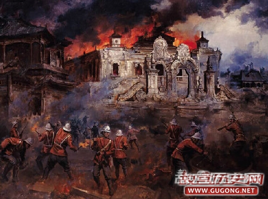 公元1860年8月,英法联军占领了大沽口和天津城,并扬言要北上,兵锋直逼北京.咸丰皇帝吓破了胆,赶紧带着一大帮官僚大臣逃往热河避难.一个月后,英法联军杀气腾腾开进了北京城.这伙强盗到处烧杀、抢掠、奸淫,干尽了坏事.闻名中外的圆明园就是在这时候惨遭浩劫的.