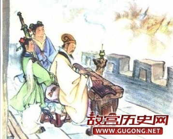 传令下去后, 诸葛亮披鹤氅, 戴纶巾, 引两个少年携带一张琴, 来到城头上, 凭栏而坐, 焚香操琴演奏。