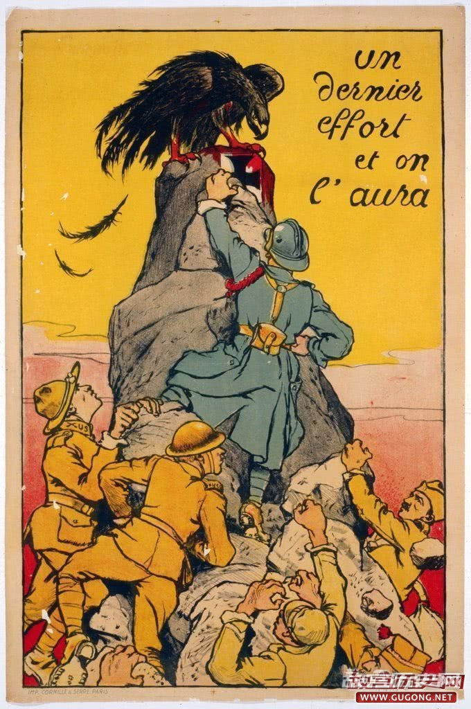 这是一战期间的一张著名海报。从海报中可以看出,一群美国士兵紧随一名法国步兵攀爬岩石。而在岩石的顶部,是象征德国的帝国鹰和铁十字勋章。