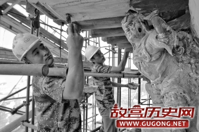 7月25日下午,在通州燃灯塔修复现场,工人正在对建筑表面做“油灰地仗”。 实习记者 武亦彬摄