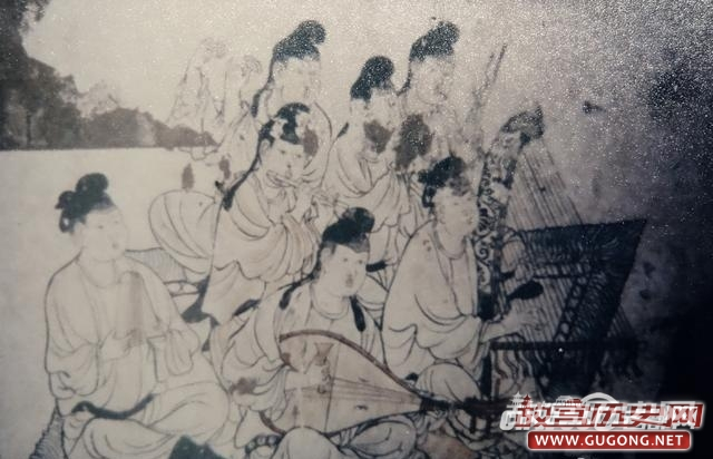 该壁画墓东壁绘制了一幅乐舞场景,此组乐伎共7人,前后参差盘坐于长方形毡毯上。她们个个面部丰腴,眉目间神情流溢,嘴唇圆润,戴黑色长脚幞,身着团领长袍,衣色各异,足蹬乌皮靴或平头履,神情专注地演奏着管弦乐和打击乐。