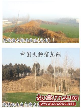 城门 初步确定城墙南门基址位于南城墙中部偏东,西距西南角楼台基约841 米,城门宽度约15 米,城墙西门基址在西城墙中部偏南,城墙东门基址位于东城墙中部偏南,北城门基址位于北城墙中部略偏东位置的豁口处,西距西北角楼内边沿756米,东距东北角楼内边沿704 米,今022 县道从城门位置东侧穿城而过。经勘探北城门基址东西宽15 米,南北两端与城墙内外角平齐,门道内堆积层厚1.8 米,门道东、西两侧有残高0.7~1.0 米的城墙夯土,城门基址地面与城墙墙基地面在同一水平面。