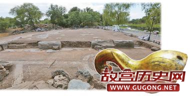 上图为如园遗址考古发掘现场。右下图为鎏金铜象首。张景华摄/光明图片