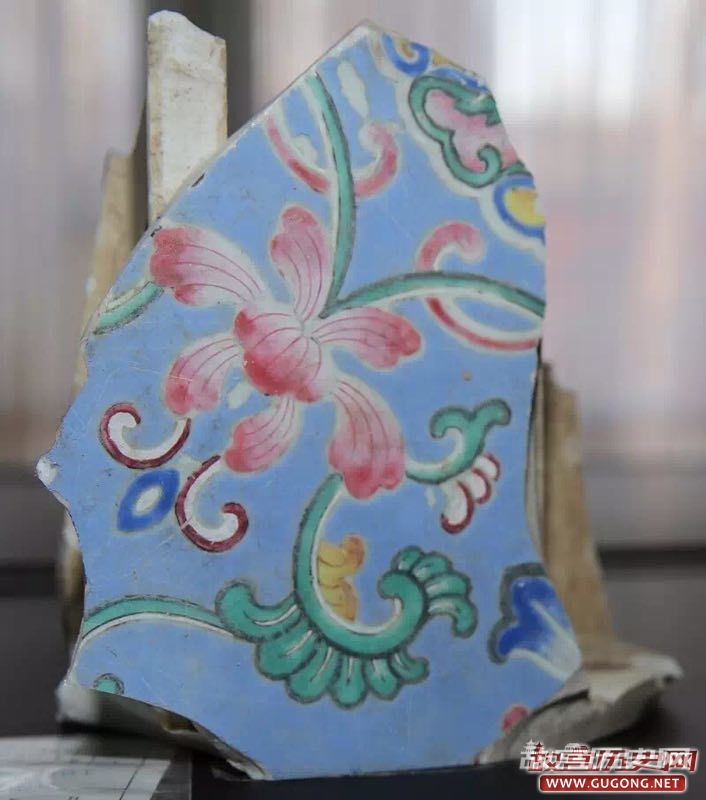 延清堂大殿粉彩地砖是一次意外收获。在发掘中,考古队员发现大殿室内铺地砖尚有残存,有金砖和粉彩瓷砖两种,金砖因过火,多数均酥裂,粉彩地砖部分表面呈黑色,也是因为过火的缘故。