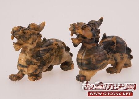 台北故宫博物院藏有一件汉代玉貔貅,其包浆莹润,曾经深沁熟盘,貔貅的胸前刻有御制诗。其下配有双层紫檀木座,上层刻有“乾隆御玩”字样,下层刻有与貔貅胸前相同的御制诗,可见其曾为乾隆皇帝的心爱收藏。另一件汉代玉貔貅现藏于故宫博物院,其上阴刻“乙巳年乾隆御题”诗。在欣赏与赞美古物的同时,乾隆皇帝也命工匠参照汉魏及南北朝时貔貅神兽的形象制作新的“仿古”器物。