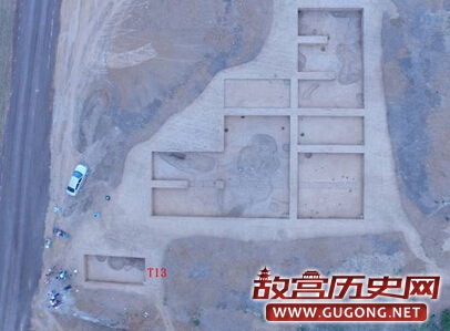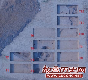 发掘区共布设5×10探方13个,分别编号为T1-T13,其中T6未发掘,实际发掘面积600平方米。