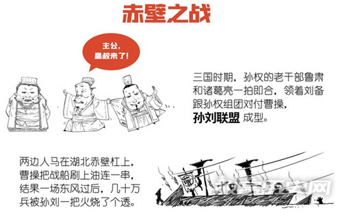 曹操在击溃刘备后,乘势想一举鲸吞江东。孙刘两军在鲁肃和诸葛亮等人的努力下,结成联盟,孙权命都督周瑜率军三万,与刘备的两万人马组成联军抵抗曹操。曹操自江陵东下,至赤壁(今湖北武昌县西赤矶山)与孙、刘联军接战不利,暂驻军于乌林(今湖北洪湖县东北),周瑜等人在南岸,双方隔江对峙。周瑜用诈降之计,命大将黄盖率小战船十艘,上装柴草,灌以膏油,船头钉上大钉,假称投降,向北岸而进,至离曹营二里之处时,各船一齐点火,然后借助风势,直向曹军冲去,曹军大败,舟船被烧。曹操率军从华容道(今湖北监利西北)陆路撤回江陵。撤军北还。