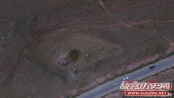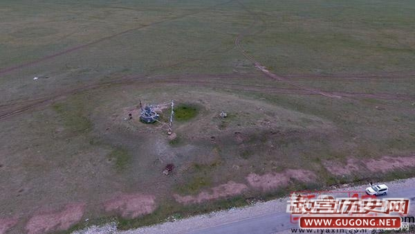 覃大海介绍,该墓葬地表形态表现为东端较圆,西端略尖、东高西低的土丘状封堆,平面似水滴状,东西长85米,最宽处58米,高3米,顶部边缘有用卵石铺成的亦呈水滴状的石圈,中部有一凹陷坑,坑之东、西两侧各有一座现代设置的蒙古敖包。滴水状封堆西约40米处还有四个直径2米许、南北排列的圆石围;再西约200米,有一片墓地,为形制较小的圆形土石堆和方形石围土石堆墓。