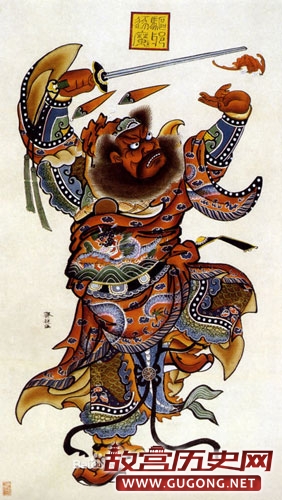 画钟馗画像的画圣吴道子的画作虽现在已失传,但在北宋时,却有人在宫廷里见过。如北宋鉴赏家郭若虚在《图画见闻志》卷六《近事》中写道:“昔吴道子画钟馗,衣蓝衫,革敦一足,眇一目,腰笏,巾首而蓬发,以左手捉鬼,以右手抉其鬼目。笔迹遒劲,实绘事之绝格也。”这是现存年代最早的钟馗画像,只不过不是吴道子画的,而是五代时期人物画家石恪的作品。由这些画除了可以知道钟馗确实面目丑陋之外,却寻不到他的真实来历。