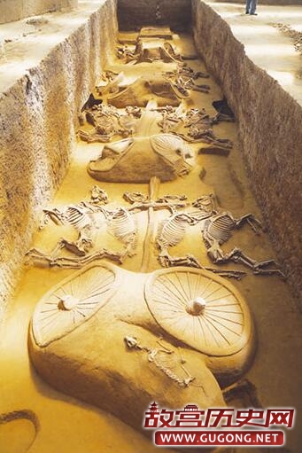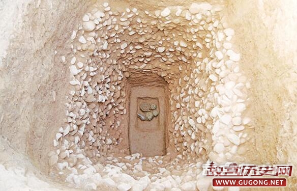 故郡墓地的墓葬有土坑墓与积石墓两类,以后者数量为多。墓葬皆为竖穴,个别有腰坑,葬具有一棺一椁、单棺和无葬具三类。部分墓葬在壁龛内殉葬牛羊头蹄,个别墓葬填土内有殉牲。墓地目前发现车马坑3座。其中一号车马坑二号车马坑正在发掘中。已发掘完毕的一号车马坑一车三马,盗扰严重,马头向东,车舆仅存残底。车轮放置在车轮槽内。马头部有石贝络饰。正在发掘中的二号车马坑坑底中部设两个壁龛,内中各殉一成年男性。坑内目前确定有4车16马,马匹杀死后摆放在系驾位,每辆车的骖、服马络辔装饰基本相同,但不同车的马匹装饰则差别明显。