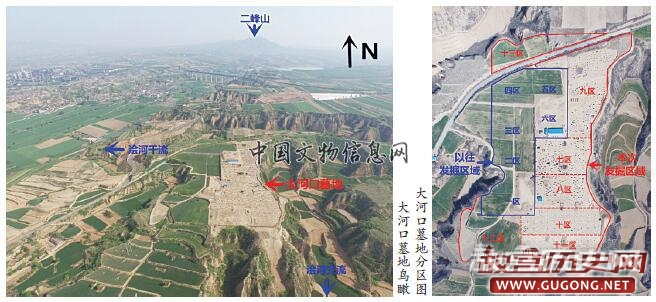 本次发掘以墓葬为主,发掘区域位于墓地的的北部、东部和南部。以往发掘已将一区至六区发掘完毕,本次发掘区域为七区至十三区。七区、八区位于墓地中部及东部,九区位于墓地东北部,十区、十一区位于墓地南部及东南部,十二区位于墓地西南部,十三区位于墓地北部。七区、八区、九区、十区东侧为沟壑,十一区东侧和南侧为沟壑,十二区西侧和南侧为沟壑,十三区北侧为沟壑。目前已经将大河口墓地现存的墓葬全部发掘完毕。