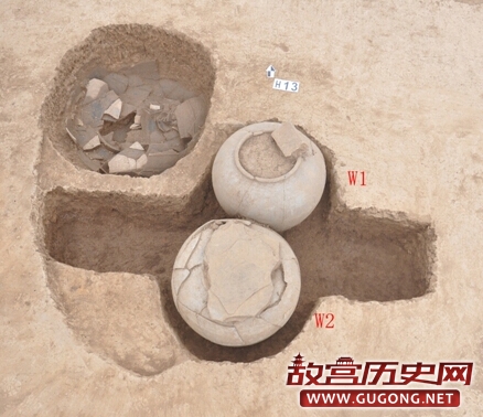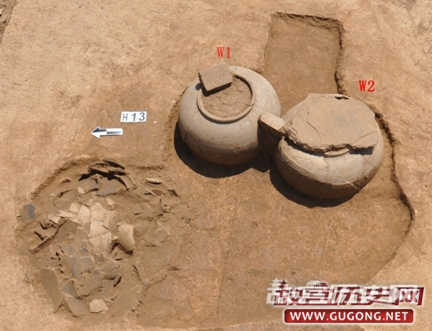 截止目前,已发掘5×10探方10个。日前,在T8内发现有南北排列的陶瓮两个,开口在第3层下,编号为W1、W2,形制大小一致,最大腹径约70厘米。