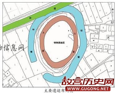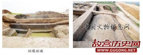 环壕 总长350 米,环绕着台地,西南角有一处宽约30 米的缺口。宽约15米,深约2 米。斜壁,环壕内为青灰色淤土,十分纯净。