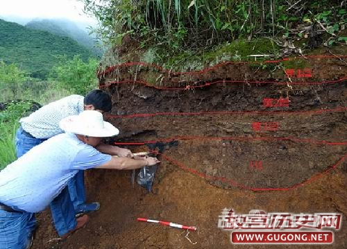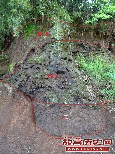 A剖面,发现了文化层:长3米,底层大致可分3层:第1层厚25厘米,为灰土色腐殖土;第2层厚20厘米,为水层堆积,呈灰褐色,含较多炼渣,夹杂少量红烧土、木炭颗粒、瓷片、石片;第3层厚15厘米,呈灰褐色,土质较杂,较板结,含木炭颗粒。第3层下面有长90厘米,高35厘米的锅底状灰坑,坑内夹杂有大小不一的炉渣,炉渣呈多孔状蜂窝状,玻化程度不高,夹杂很多木炭。灰坑右边有高35厘米,长30厘米的红色过火坑。灰坑左边有长70厘米高3-10厘米的碎木炭堆积。