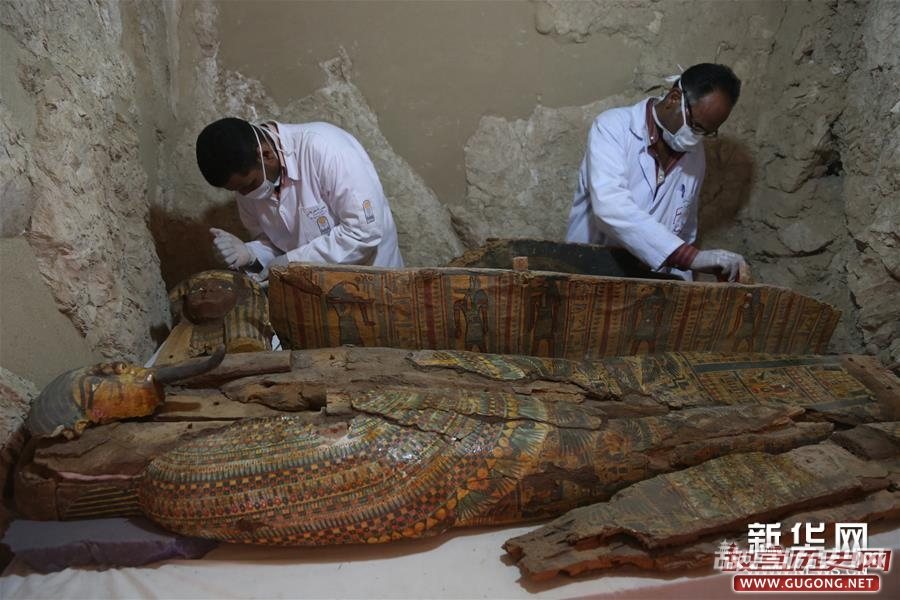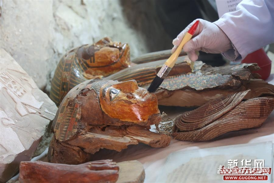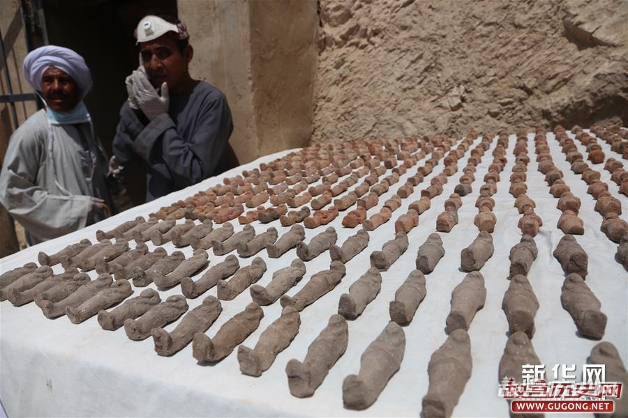 4月18日,在埃及古城卢克索,工作人员展示乌塞尔哈特墓出土的文物。新华社发(艾哈迈德·戈马 摄)