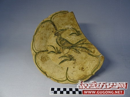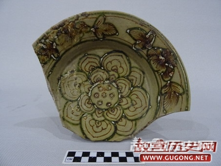 图七、H10③层出土青釉褐绿彩绘莲花纹盘