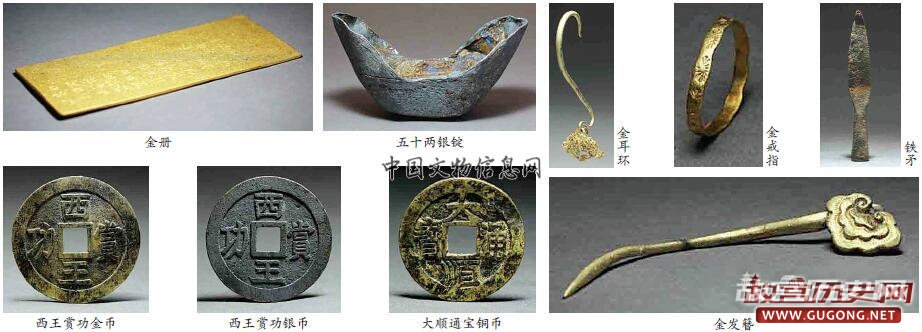 此次发掘发现了上万件珍贵文物。据项目负责人刘志岩介绍,这些文物包括西王赏功金币、银币、大顺通宝铜币,这是和张献忠直接相关的文物,发现“木鞘”,这也是历史记载张献忠转运金银的工具。此外还有明代册封藩王的金册、银册,带有铭文的明代官银以及戒指、耳环、发簪等数量巨大、种类丰富的金银首饰。还有一类重要文物是各种兵器,如铁刀、铁剑、铁矛、铁箭镞等,也是这里发生过战争的佐证。