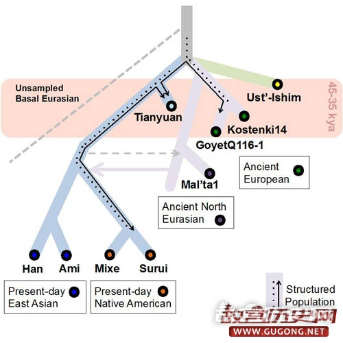 论文还披露了一些出乎意料的发现。分析显示,40000年前的田园洞人和一个来自比利时35000年前的古欧洲人有着遗传上的联系。这种联系在同时期的其他古欧洲人中并没有被发现。因此,很有可能当时的东亚人并非和欧洲人发生基因交流,而是与同田园洞人和比利时古人相关的一个未知人群发生过基因交流;这个未知人群从尚未分化的古欧亚人群中的某一亚群演化而来。这两个古人个体之间的遗传联系,为欧洲人和亚洲人具有复杂的遗传历史提供了有力的直接证据。