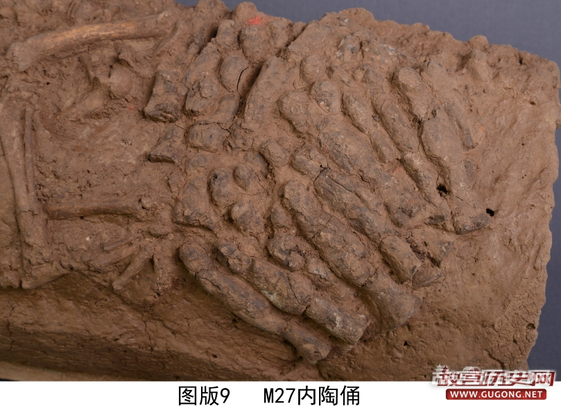 这次发现的小狗墓,墓口长0.76米、宽0.64米、深0.4米,葬具为一段基本完整,两端无堵挡物的灰陶水管。这只骨架完整的小狗,头向西侧身安放、腿骨稍屈,通长34厘米。令考古工作者意外的是,在狗尾和腿骨后面,发现了31个小陶俑。陶俑头呈三角形,面部不清,身体瘦长,下着小喇叭口裙,最高在10-11厘米之间。