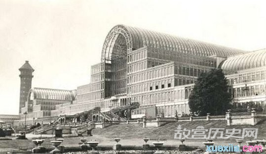 水晶宫1850年9月26日水晶宫第一根柱子落地,1851年建筑物完成。在建造中,帕克斯顿为保留原场地中的一些榆树,他测得那些树的高度后,便在设计中增加了一个桶状的圆顶。