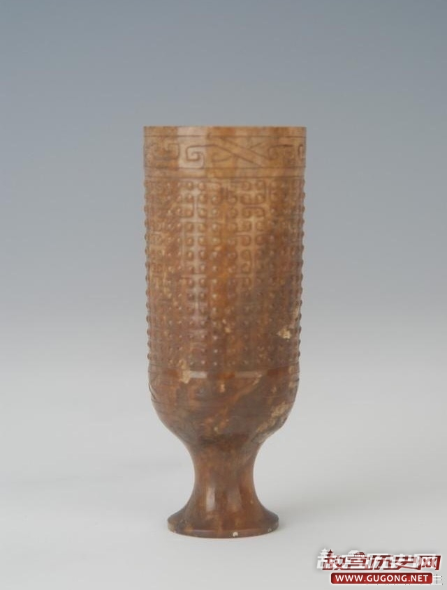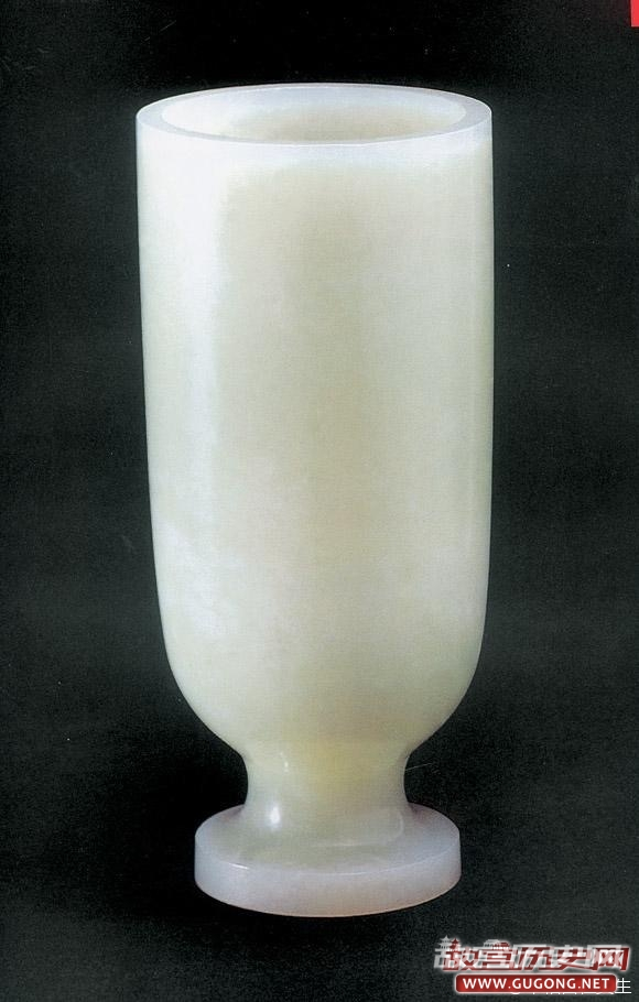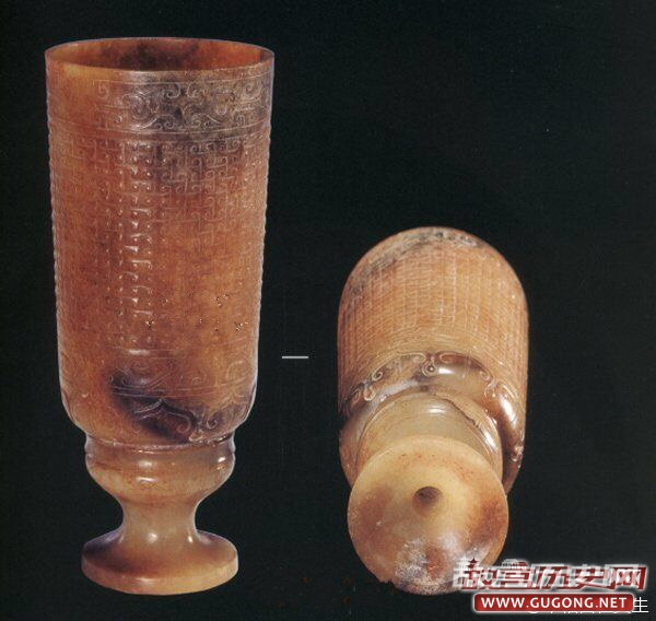 战国水晶杯,1990年杭州半山镇石塘村战国一号墓出土。秦代高足玉杯,1976年西安长安区车刘村秦阿房宫遗址出土。西汉谷纹高足玉杯,1976年广西贵县罗泊湾1号墓出土。三国曹魏白玉杯,1956年洛阳曹魏正始八年墓出土。