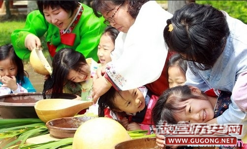 韩国人将“端午”称为“上日”,意为神的日子。过去韩国人家家户户都会在端午节当天摆上白白的散发着艾草和糯米香味的艾子糕,用菖蒲汤洗头求吉利,喝菖蒲水以辟邪。人们还会穿着传统服装参加祭祀、演出和运动会,观看荡秋千和摔跤比赛。