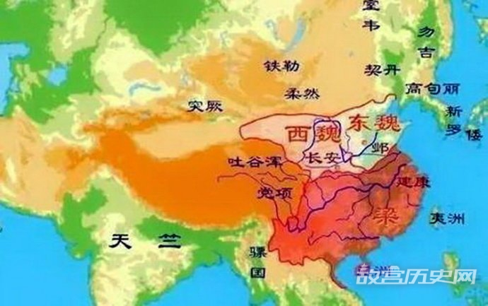 南北朝时期是中国历史上最混乱的时期,特别是那北朝,号称十六国,想记住真是个难事,这其中最重要的国家有二,一是符坚的前秦,一是拓跋氏的北魏。前者派生出慕容垂的后燕和姚苌的后秦,后者诞生了高欢的东魏和宇文泰的西魏,先记住这有影响的两个大国,一关联也就有六个了哈。