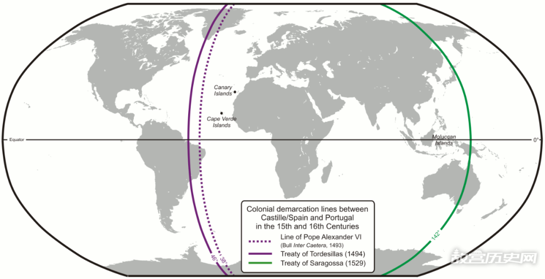 分隔卡斯蒂利亚(今西班牙)和葡萄牙势力范围的界线:1494年托德西里亚斯条约规定的子午线(紫线)以及1529年萨拉戈萨条约规定的子午线(绿线)