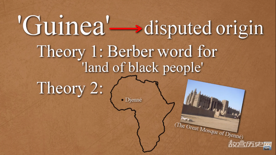 他认为,Guinea来源于尼日尔河三角洲的商业城市Djenné(今马里城市)。从11世纪到13世纪,这座城市主导了整个西非地区的黄金和食盐贸易,正是在这段时期,Genewah一词出现在阿拉伯语词源中,用以代指“黑人”。但不管怎样,这两种说法都将“几内亚”与黑人联系起来。