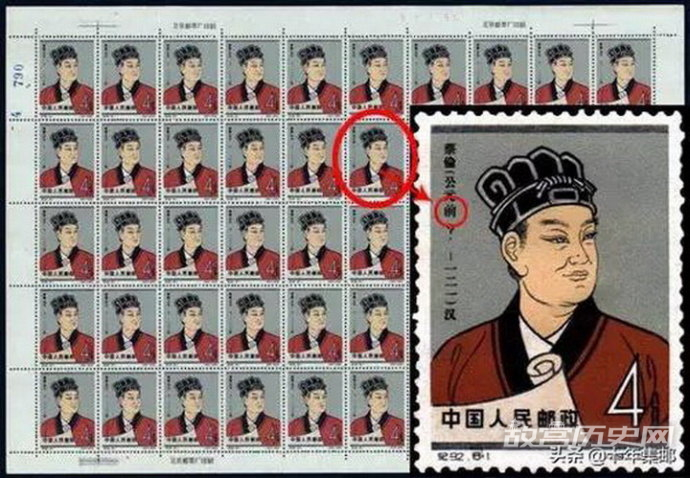 六十年代中国邮政发行了一套中国古代科学家邮票,其中就有这蔡伦造纸,可搞笑的是在蔡伦的出生年份“公元”两字后面,多了一个“前”字,成了“公元前?”这就把蔡伦的出生日期整整提前了几百年,邮票图稿经过层层审查也未发现这一错误,直到邮票打样时才被发现。