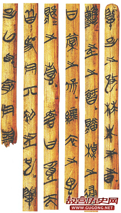 2.楚文字。由于楚地水网密布,地下水系发达,楚地墓葬往往完全浸泡在水中,因此保存了大量的简帛。竹简这东西,要么泡在水里隔绝空气,要么在西北大漠的干燥环境下还能保存下来,中原地区不干不湿,汉晋尚有发见,如今尽已朽烂,无从得见。所以现在看到的竹简,主要为楚简和汉简以及少量秦简,由于汉简不属于古文字材料,楚文字就成为当前战国文字研究中材料最为丰富的一系。楚人浪漫,有点像现在的法国人,所以楚文字简省较多,字形飘逸,在战国文字中独具特色。