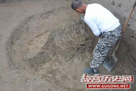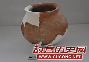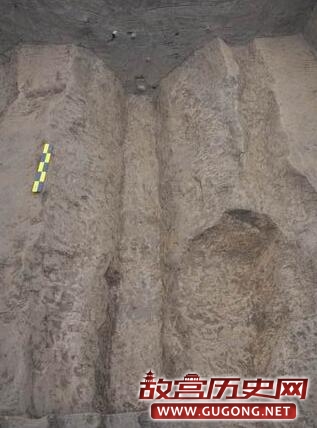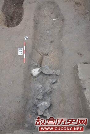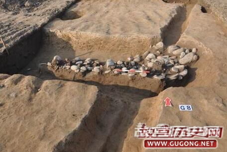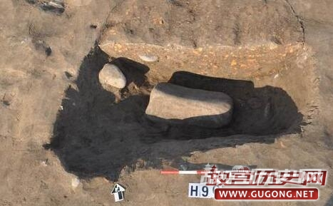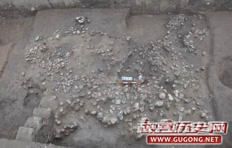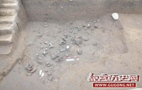 商代遗存遍布整个发掘区域,主要为遗址的第3层及开口于该层之下灰坑、沟、房子等遗迹。其中灰坑数量最多,已清理130多个,形状、大小各异,依据填土的差异,可大体分为灰土坑、砺石坑、烧土坑、沙土坑等不同的类型,或暗示它们具有不同的功能和用途。灰土坑最常见,一般填灰黑色土,多数的平面形状不甚规则(图三),也有部分呈比较规则的圆形、椭圆形、长条形等,后者的坑壁都比较规整,底部常见集中或分散分布的砺石及陶片(图四),不排除其中有作为墓葬或其它用途的可能性。此外,H309的底部两侧发现有圆形的浅坑(图五),开口于底部填土之下,直径约10厘米,深度仅2—3厘米,填灰黑色土并夹有较多的炭屑、烧土颗粒,就深度而言应非柱洞,其性质和功能还有待于进一步考证。砺石坑即填有大量砺石的土坑,数量较少,大小不一,其中较大者如H323(图六),坑内砺石的分布面积接近20平米,小者如H352(图七),平面形状为圆形,直径约60厘米,其用途都还有待于进一步明确。此外,有一处砺石坑与水沟相连通(图八),似有明显的进水口和出水口,或为蓄水池?烧土坑内填大量细碎的红烧土,目前只发现一个,平面形状接近正方形,包含物除陶片外,有少量疑似墙体的残块,坑的底部还侧放一块长度达50余厘米的石块(图九)。沙土坑的平面形状一般呈比较规整的圆形,其内填非常细腻的青灰色沙土(图十),包含物极少,似经过人为拣选,推测部分可能为烧制陶器或屋内垫土所用的储土坑。沟的数量也较多,已清理18条,从走向和时代推断,部分可相互连通,因此这些沟应当为水沟。其中位于遗址南部边缘的G1呈东西走向,开口宽度接近3米,深约1.3米,底部收缩至宽度仅30—50厘米,已知长度约30米,惜因后期破坏而未能进一步弄清其走向(图十一)。位于遗址中部的G9结构与G1基本相同,亦为东西走向(图十二),开口宽度在2米以上(上部已破坏),底部宽度收缩至约20厘米,已知长度应超过30米,其西端被晚期的大坑所破坏,东端进一步延伸至未发掘区域。以上两条水沟是目前我们在遗址中发现的规模最大的沟类遗迹,它们可能共同组成遗址中最主要的引水和排水系统,因而对于我们认识宝塔遗址聚落布局具有重要价值。目前商代的房子发现数量很少,且保存很差,形制和结构尚不甚清楚,故暂不作介绍。